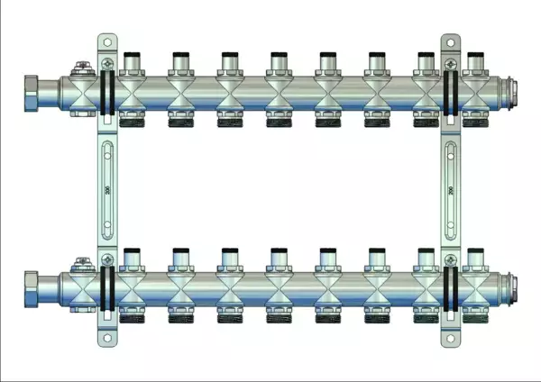 integrierte Regulierventile im Vor- und Rücklaufbalken, Entlüftungsventil im Vor- und Rücklaufbalken, Doppelwandhalter 200 mm mit Schrauben und Dübeln