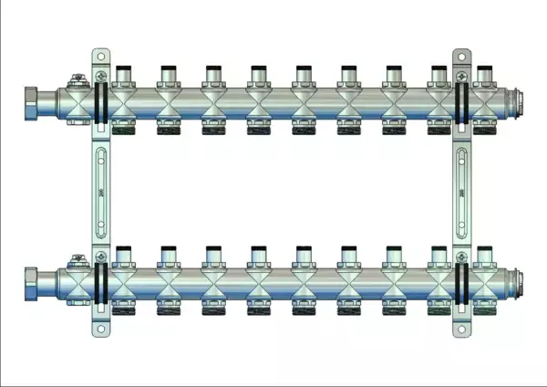 strawa HK-Anschlussverteiler e-class 55 ohne SFE 9 Hkr.,BxHxT: 545x320x67 mm, integr. Regulierventil im VL und RL, Entlüftungsventil im VL und RL, Doppelwandhalter 200 mm mit Schrauben u. Dübeln