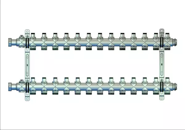 strawa HK-Anschlussverteiler e-class 55 ohne SFE 13 Hkr.,BxHxT: 745x320x67 mm, integr. Regulierventil im VL und RL, Entlüftungsventil im VL und RL, Doppelwandhalter 200 mm mit Schrauben u. Dübeln
