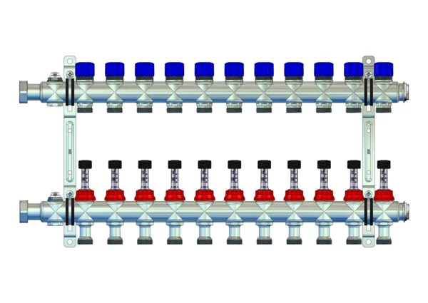 Der Anschlussverteiler für Flächenheizung und -kühlung gewährleistet einen präzisen hydraulischen Abgleich der Heizkreise durch manuell integrierte Durchflussanzeiger im Vorlaufbalken und Ventileinsätze (M30x1,5) im Rücklaufbalken. Die Anschlussgarnitur am Primäranschluss ist separat erhältlich und bietet die Flexibilität, unterschiedliche Anschlussgarnituren mit oder ohne Wärmezählerverrohrung zu wählen.