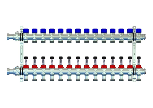 Der Anschlussverteiler für Flächenheizung und -kühlung gewährleistet einen präzisen hydraulischen Abgleich der Heizkreise durch manuell integrierte Durchflussanzeiger im Vorlaufbalken und Ventileinsätze (M30x1,5) im Rücklaufbalken. Die Anschlussgarnitur am Primäranschluss ist separat erhältlich und bietet die Flexibilität, unterschiedliche Anschlussgarnituren mit oder ohne Wärmezählerverrohrung zu wählen.