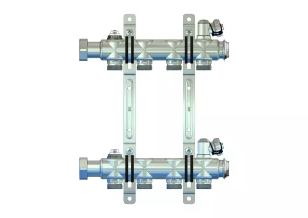 Der Anschlussverteiler für den Heizkörperanschluss ist ein Edelstahlverteiler ohne zusätzliche Einbauten in den Heizkreisabgängen. Die Anschlussgarnitur am Primäranschluss ist separat erhältlich, wodurch die Möglichkeit besteht, verschiedene Anschlussgarnituren mit oder ohne Wärmezählerverrohrung auszuwählen.