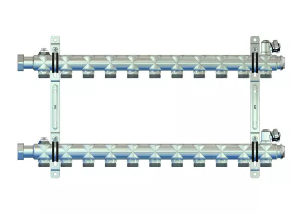 Spül-, Füll- und Entleerventil und Entlüftungsventil im Vor- und Rücklaufbalken, Doppelwandhalter 200 mm mit Schrauben und Dübeln