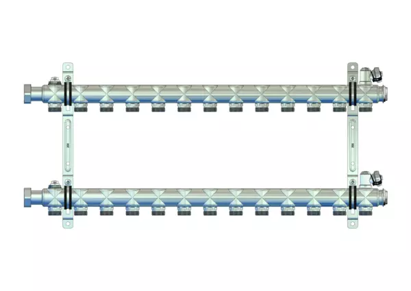 Der Anschlussverteiler für den Heizkörperanschluss ist ein Edelstahlverteiler ohne zusätzliche Einbauten in den Heizkreisabgängen. Die Anschlussgarnitur am Primäranschluss ist separat erhältlich, wodurch die Möglichkeit besteht, verschiedene Anschlussgarnituren mit oder ohne Wärmezählerverrohrung auszuwählen.