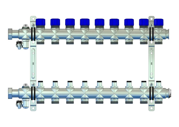 Der Anschlussverteiler für Flächenheizung und -kühlung steht für einen herausragenden hydraulischen Abgleich der Heizkreise durch die Integration von manuell regulierbaren Ventilen im Vorlaufbalken und Ventileinsätzen (M30x1,5) im Rücklaufbalken. Die Anschlussgarnitur am Primäranschluss ist separat erhältlich und bietet die Flexibilität, unterschiedliche Anschlussgarnituren mit oder ohne Wärmezählerverrohrung zu wählen.