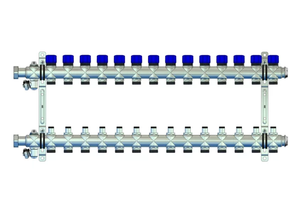 Der Anschlussverteiler für Flächenheizung und -kühlung steht für einen herausragenden hydraulischen Abgleich der Heizkreise durch die Integration von manuell regulierbaren Ventilen im Vorlaufbalken und Ventileinsätzen (M30x1,5) im Rücklaufbalken. Die Anschlussgarnitur am Primäranschluss ist separat erhältlich und bietet die Flexibilität, unterschiedliche Anschlussgarnituren mit oder ohne Wärmezählerverrohrung zu wählen.