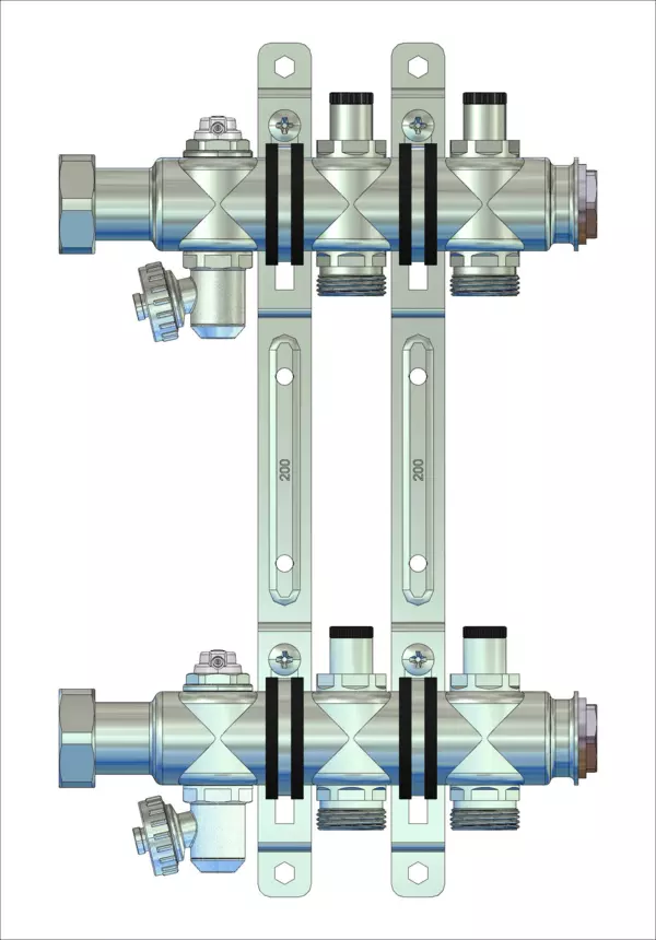 integrierte Regulierventile im Vor- und Rücklaufbalken, Spül-, Füll- und Entleerventil und Entlüftungsventil im Vor- und Rücklaufbalken, Doppelwandhalter 200 mm mit Schrauben und Dübeln