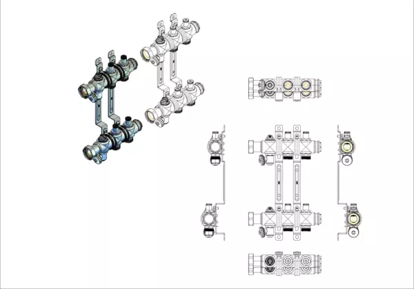 • Vorlauf- und Rücklaufbalken mit integrierten Regulierventilen mit Memoryfunktion (Kvs=2,88 m³/h)