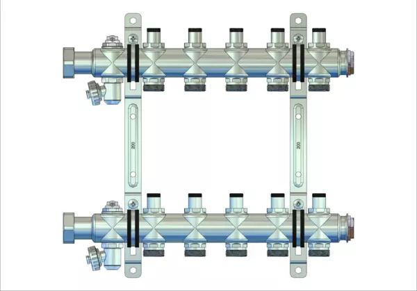 integrierte Regulierventile im Vor- und Rücklaufbalken, Spül-, Füll- und Entleerventil und Entlüftungsventil im Vor- und Rücklaufbalken, Doppelwandhalter 200 mm mit Schrauben und Dübeln
