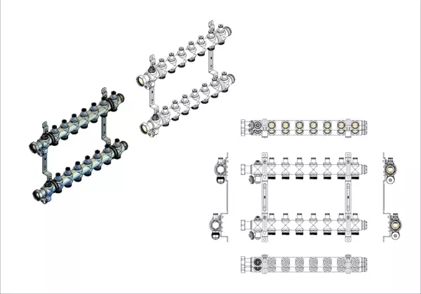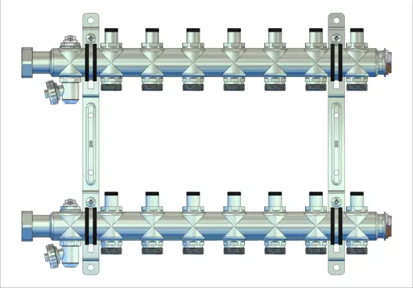 integrierte Regulierventile im Vor- und Rücklaufbalken, Spül-, Füll- und Entleerventil und Entlüftungsventil im Vor- und Rücklaufbalken, Doppelwandhalter 200 mm mit Schrauben und Dübeln