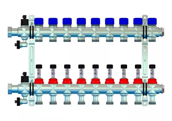 Der Anschlussverteiler für Flächenheizung und -kühlung gewährleistet einen präzisen hydraulischen Abgleich der Heizkreise durch manuell integrierte Durchflussanzeiger im Vorlaufbalken und Ventileinsätze (M30x1,5) im Rücklaufbalken. Die Anschlussgarnitur am Primäranschluss ist separat erhältlich und bietet die Flexibilität, unterschiedliche Anschlussgarnituren mit oder ohne Wärmezählerverrohrung zu wählen.