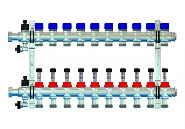 Der Anschlussverteiler für Flächenheizung und -kühlung gewährleistet einen präzisen hydraulischen Abgleich der Heizkreise durch manuell integrierte Durchflussanzeiger im Vorlaufbalken und Ventileinsätze (M30x1,5) im Rücklaufbalken. Die Anschlussgarnitur am Primäranschluss ist separat erhältlich und bietet die Flexibilität, unterschiedliche Anschlussgarnituren mit oder ohne Wärmezählerverrohrung zu wählen.