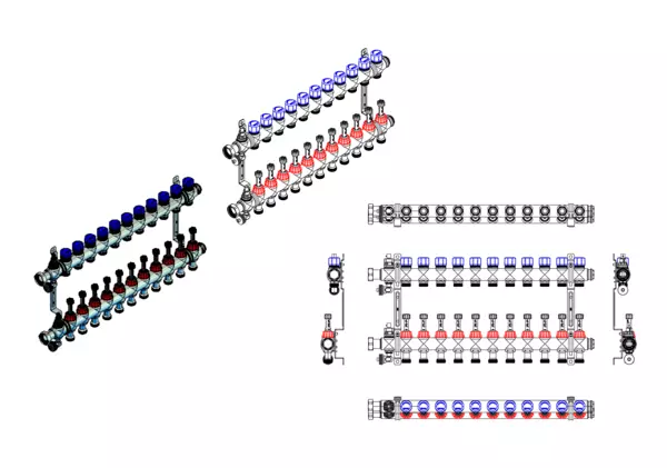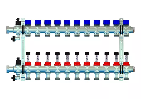 integrierte Durchflussanzeiger 0-3 l/min im Vorlaufbalken und Thermostatventileinsätze M30x1,5 im Rücklaufbalken, Spül-, Füll-, Entleer- und Entlüftungsventil im Vor- und Rücklaufbalken, Doppelwandhalter 200 mm mit Schrauben und Dübeln