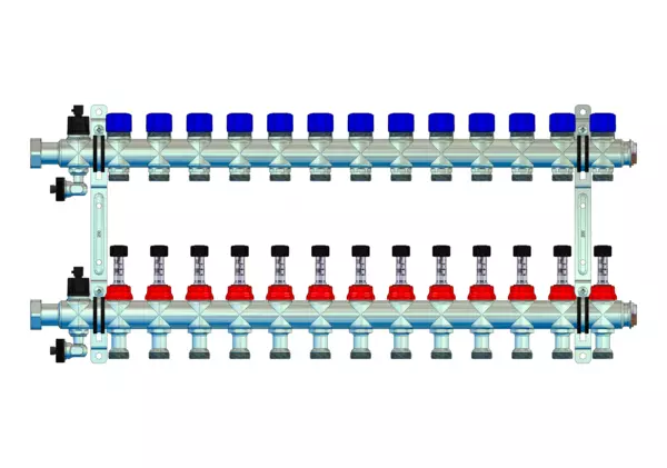 Der Anschlussverteiler für Flächenheizung und -kühlung gewährleistet einen präzisen hydraulischen Abgleich der Heizkreise durch manuell integrierte Durchflussanzeiger im Vorlaufbalken und Ventileinsätze (M30x1,5) im Rücklaufbalken. Die Anschlussgarnitur am Primäranschluss ist separat erhältlich und bietet die Flexibilität, unterschiedliche Anschlussgarnituren mit oder ohne Wärmezählerverrohrung zu wählen.