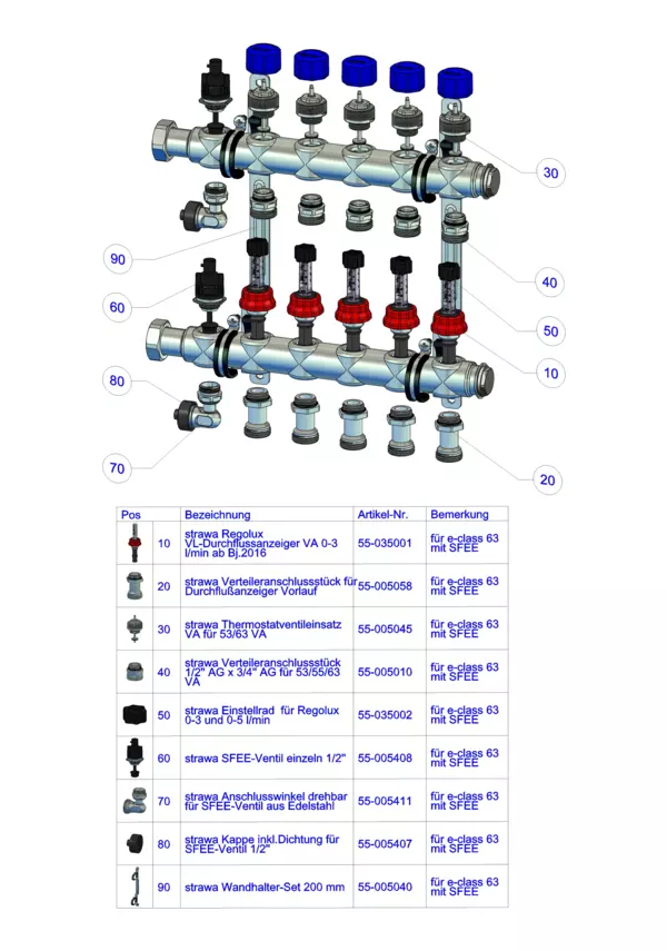 strawa FB-Anschlussverteiler e-class 63 mit SFEE 13 Hkr.,BxHxT: 745 x 320 x 67 mm, integr. DFA 0-3 l/min im VL und THV M30x1,5 im RL, Spül-, Füll- und Entleer- und Entlüftungsventil im VL und RL, Doppelwandhalter 200 mm mit Schrauben u. Dübeln