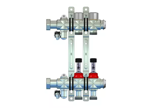 integrierte Durchflussanzeiger min/max. im Vorlaufbalken und Thermostatventileinsätze mit Q-Tech Durchflussregler M30x1,5 im Rücklaufbalken, Spül-, Füll- und Entleerventil und Entlüftungsventil im Vor- und Rücklaufbalken, Doppelwandhalter 200 mm mit Schrauben und Dübeln