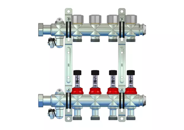 integrierte Durchflussanzeiger min/max. im Vorlaufbalken und Thermostatventileinsätze mit Q-Tech Durchflussregler M30x1,5 im Rücklaufbalken, Spül-, Füll- und Entleerventil und Entlüftungsventil im Vor- und Rücklaufbalken, Doppelwandhalter 200 mm mit Schrauben und Dübeln