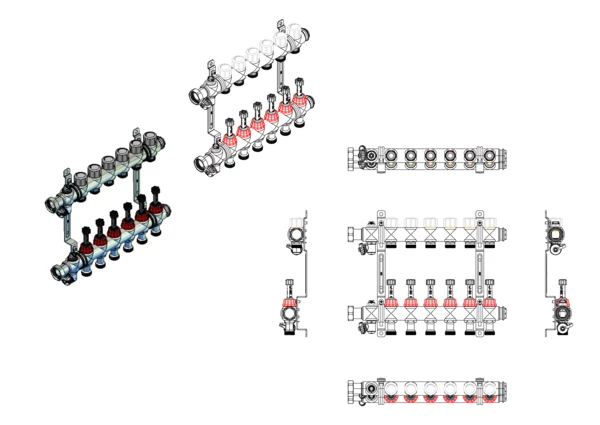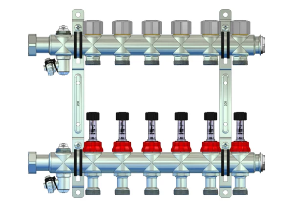 integrierte Durchflussanzeiger min/max. im Vorlaufbalken und Thermostatventileinsätze mit Q-Tech Durchflussregler M30x1,5 im Rücklaufbalken, Spül-, Füll- und Entleerventil und Entlüftungsventil im Vor- und Rücklaufbalken, Doppelwandhalter 200 mm mit Schrauben und Dübeln