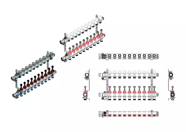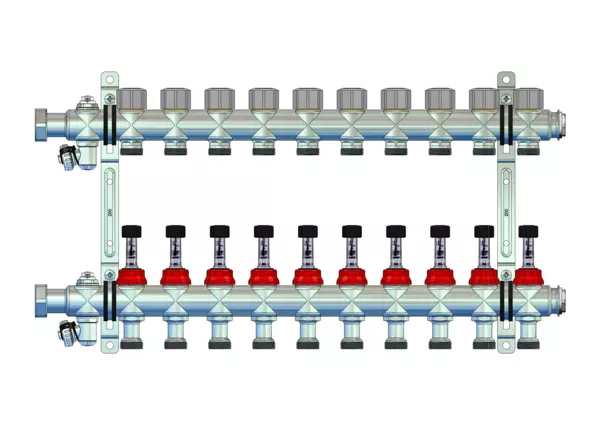 integrierte Durchflussanzeiger min/max. im Vorlaufbalken und Thermostatventileinsätze mit Q-Tech Durchflussregler M30x1,5 im Rücklaufbalken, Spül-, Füll- und Entleerventil und Entlüftungsventil im Vor- und Rücklaufbalken, Doppelwandhalter 200 mm mit Schrauben und Dübeln