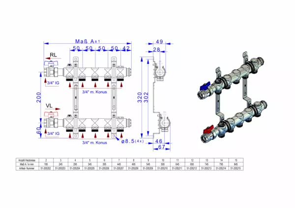strawa HK-Anschlussverteiler e-class 52 ohne SFE mit 3/4''KH 13 Hkr.,BxHxT: 745x320x67 mm, 3/4" Kugelhahn, Entlüftungsventil im VL und RL, Doppelwandhalter 200 mm mit Schrauben u. Dübeln