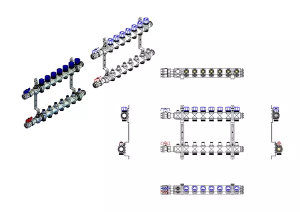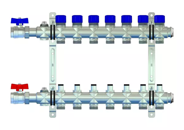 strawa FB-Anschlussverteiler e-class 53 ohne SFE mit 3/4''KH 7 Hkr.,BxHxT: 495x320x67 mm, 3/4" Kugelhahn, integr. Regulierventil im VL und THV M30x1,5 im RL, Entlüftungsventil im VL und RL, Doppelwandhalter 200 mm mit Schrauben u. Dübeln