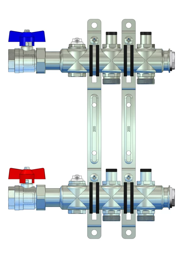 Der Anschlussverteiler für den Heizkörperanschluss gewährleistet einen effizienten hydraulischen Abgleich der Heizkreise durch manuell integrierte Regulierventile im Vor- und Rücklaufbalken. Der Primäranschluss beinhaltet eine Anschlussgarnitur ohne Wärmezählervorbereitung zum Absperren des Verteilers.