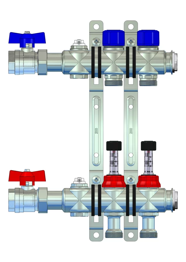 strawa FB-Anschlussverteiler e-class 63 ohne SFEE mit 3/4''KH 2 Hkr.,BxHxT: 245x320x67 mm, 3/4" Kugelhahn, integr. DFA 0-3 l/min im VL und THV M30x1,5 im RL, Entlüftungsventil im VL und RL, Doppelwandhalter 200 mm mit Schrauben u. Dübeln