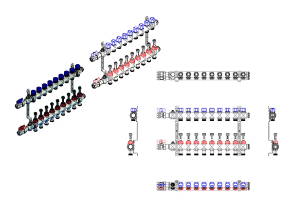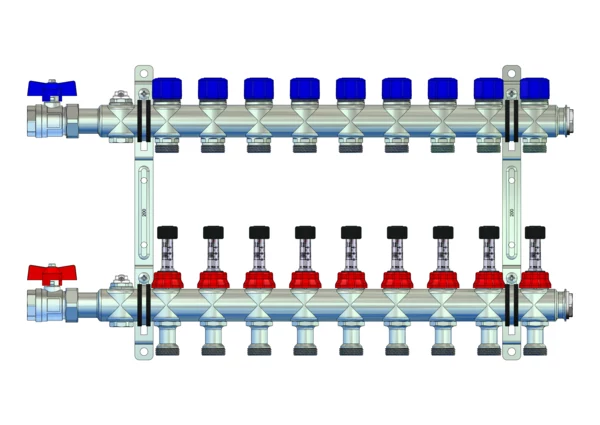 strawa FB-Anschlussverteiler e-class 63 ohne SFEE mit 3/4''KH 9 Hkr.,BxHxT: 595x320x67 mm, 3/4" Kugelhahn, integr. DFA 0-3 l/min im VL und THV M30x1,5 im RL, Entlüftungsventil im VL und RL, Doppelwandhalter 200 mm mit Schrauben u. Dübeln