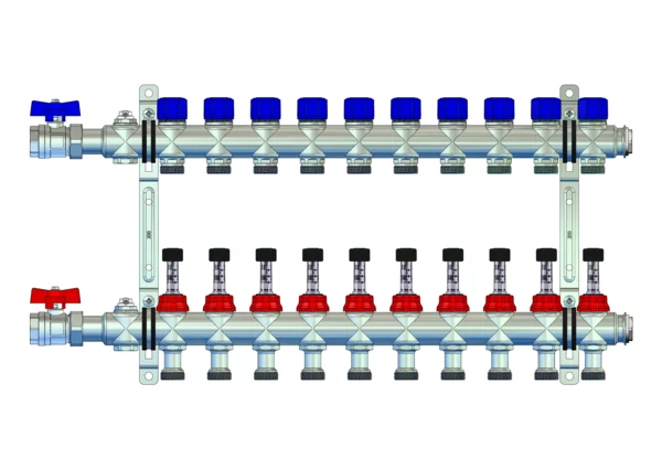 Der Anschlussverteiler für Flächenheizung und -kühlung gewährleistet den hydraulischen Abgleich der Heizkreise über manuell integrierte Durchflussanzeiger und Ventileinsätze (M30x1,5). Der Primäranschluss beinhaltet eine Anschlussgarnitur ohne Wärmezählervorbereitung zum Absperren des Verteilers.