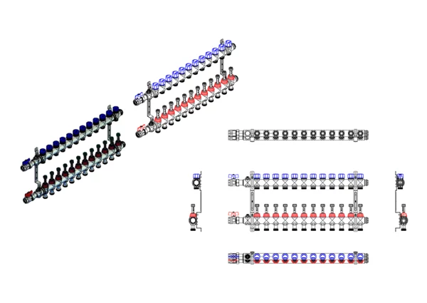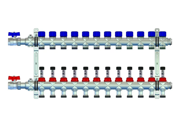 strawa FB-Anschlussverteiler e-class 63 ohne SFEE mit 3/4''KH 12 Hkr.,BxHxT: 745x320x67 mm, 3/4" Kugelhahn, integr. DFA 0-3 l/min im VL und THV M30x1,5 im RL, Entlüftungsventil im VL und RL, Doppelwandhalter 200 mm mit Schrauben u. Dübeln