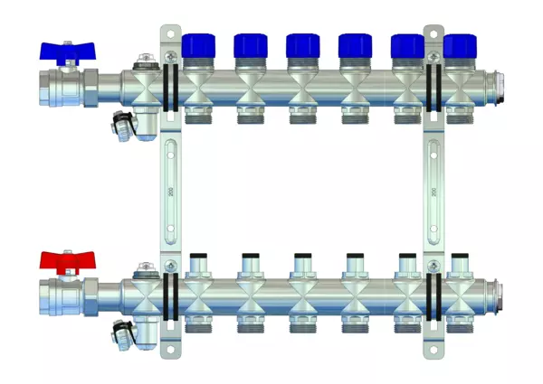 strawa FB-Anschlussverteiler e-class 53 mit SFE, mit 3/4''KH 6 Hkr.,BxHxT: 445x320x67 mm, 3/4" Kugelhahn, integr. Regulierv. im VL u THV M30x1,5 im RL, Spül-, Füll- und Entleerv. u Entlüftungsv. im VL + RL, Doppelw.halter 200mm m Schrauben u Dübeln