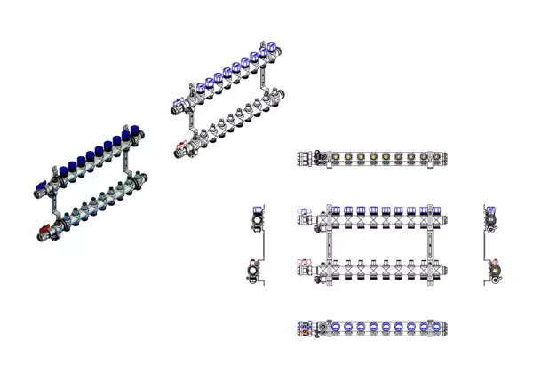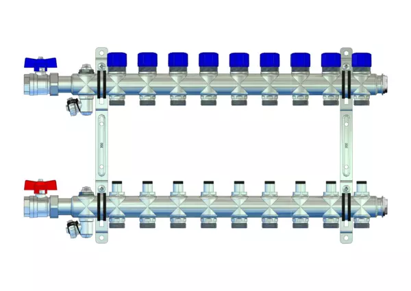 strawa FB-Anschlussverteiler e-class 53 mit SFE, mit 3/4''KH 9 Hkr.,BxHxT: 595x320x67 mm, 3/4" Kugelhahn, integr. Regulierv. im VL u THV M30x1,5 im RL, Spül-, Füll- und Entleerv. u Entlüftungsv. im VL + RL, Doppelw.halter 200mm m Schrauben u Dübeln