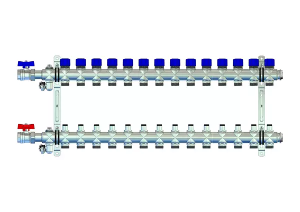 Der Anschlussverteiler für Flächenheizung und -kühlung steht für einen herausragenden hydraulischen Abgleich der Heizkreise durch die Integration von manuell regulierbaren Ventilen im Vorlaufbalken und Ventileinsätzen (M30x1,5) im Rücklaufbalken. Der Primäranschluss beinhaltet eine Anschlussgarnitur ohne Wärmezählervorbereitung zum Absperren des Verteilers.