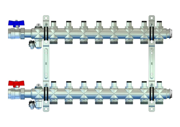 • Vorlauf- und Rücklaufbalken mit integrierten Regulierventilen mit Memoryfunktion (Kvs=2,88 m³/h)