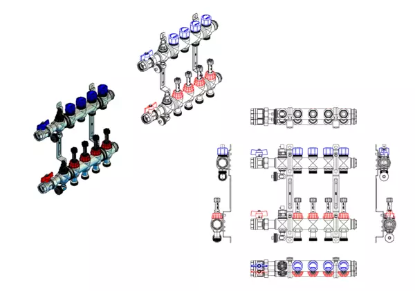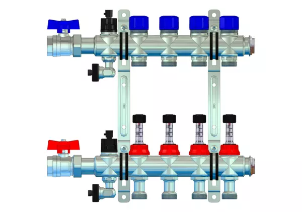 Der Anschlussverteiler für Flächenheizung und -kühlung gewährleistet einen präzisen hydraulischen Abgleich der Heizkreise durch manuell integrierte Durchflussanzeiger im Vorlaufbalken und Ventileinsätze (M30x1,5) im Rücklaufbalken. Der Primäranschluss beinhaltet eine Anschlussgarnitur ohne Wärmezählervorbereitung zum Absperren des Verteilers.