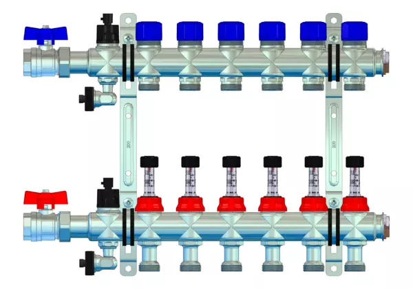 strawa FB-Anschlussverteiler e-class 63 mit SFEE, mit 3/4''KH 6 Hkr.,BxHxT: 445x320x67 mm, 3/4" Kugelhahn, DFA 0-3 l/min im VL u THV M30x1,5 im RL, Spül-, Füll- und Entleerv. u Entlüftungsv. im VL + RL, Doppelw.halter 200mm m Schrauben u Dübeln