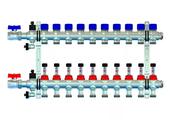Der Anschlussverteiler für Flächenheizung und -kühlung gewährleistet einen präzisen hydraulischen Abgleich der Heizkreise durch manuell integrierte Durchflussanzeiger im Vorlaufbalken und Ventileinsätze (M30x1,5) im Rücklaufbalken. Der Primäranschluss beinhaltet eine Anschlussgarnitur ohne Wärmezählervorbereitung zum Absperren des Verteilers.