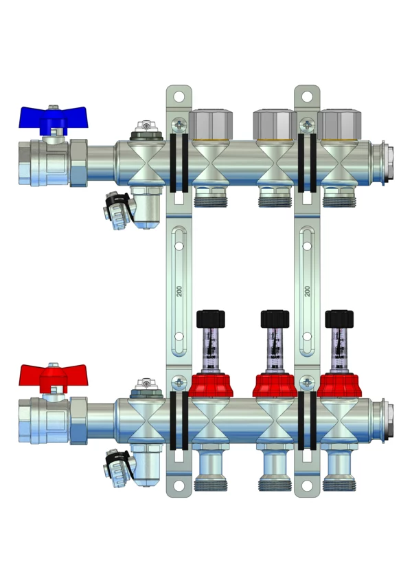 strawa FB-Anschlussverteiler e-class 87 mit SFE, mit 3/4''KH 3 Hkr.,BxHxT: 245x320x67 mm, 3/4" Kugelhahn, DFA min/max. im VL u THV m Q-Tech Durchflussregler M30x1,5 im RL, SFE-Ventil u Entlüftungsv. im VL + RL, Doppelwandhalt m Schrauben u. Dübeln