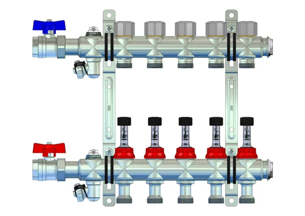 Der Anschlussverteiler für Flächenheizung und -kühlung gewährleistet einen automatischen hydraulischen Abgleich der Heizkreise durch Thermostateinsätze mit Durchflussregler Q-Tech (M30x1,5) im Rücklaufbalken und Durchflussanzeiger im Vorlaufbalken. Der Primäranschluss beinhaltet eine Anschlussgarnitur ohne Wärmezählervorbereitung zum Absperren des Verteilers.