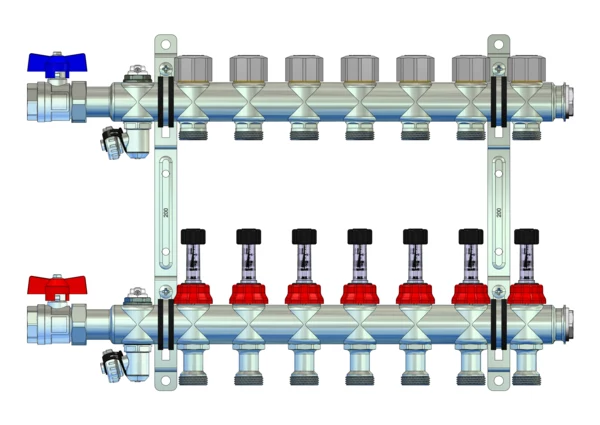 1. Kugelhahn-Set, integrierte Durchflussanzeiger min/max. im Vorlaufbalken und Thermostatventileinsätze mit Q-Tech Durchflussreglern M30x1,5 im Rücklaufbalken, Spül-, Füll- und Entleerventil u Entlüftungsv. im Vorlauf + Rücklauf, Doppelwandhalt 200mm m Schrauben und Dübeln