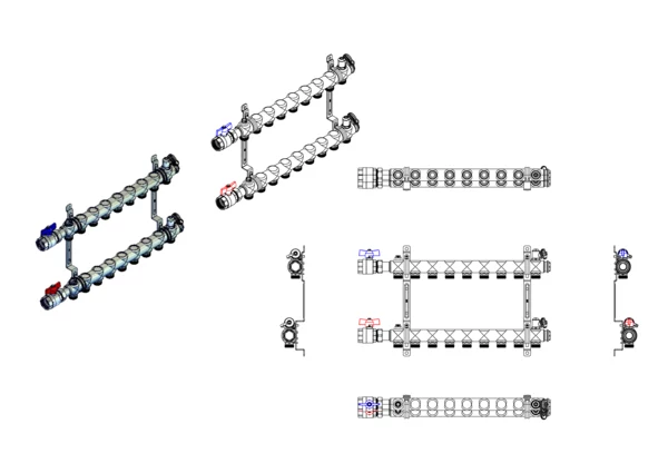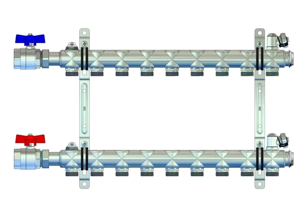 strawa HK-Anschlussverteiler e-class 52 mit SFE, mit 1''KH 9 Hkr.,BxHxT: 560x320x67 mm, 1" Kugelhahn, Spül-, Füll- und Entleerventil und Entlüftungsventil im VL und RL, Doppelwandhalter 200 mm mit Schrauben u. Dübeln