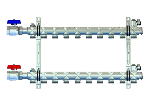 strawa HK-Anschlussverteiler e-class 52 mit SFE, mit 1''KH 10 Hkr.,BxHxT: 610x320x67 mm, 1" Kugelhahn, Spül-, Füll- und Entleerventil und Entlüftungsventil im VL und RL, Doppelwandhalter 200 mm mit Schrauben u. Dübeln