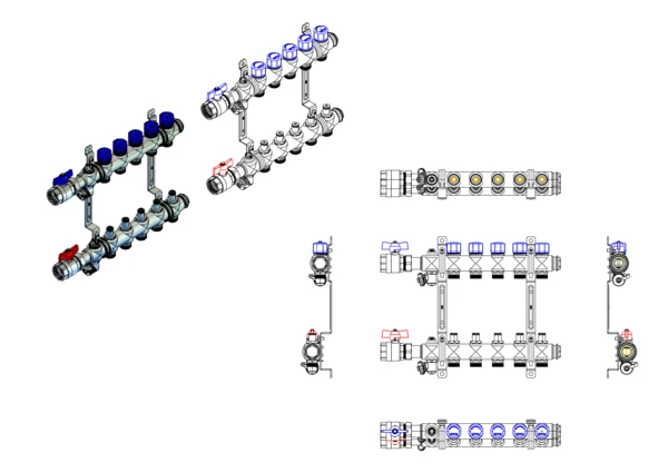 Der Anschlussverteiler für Flächenheizung und -kühlung steht für einen herausragenden hydraulischen Abgleich der Heizkreise durch die Integration von manuell regulierbaren Ventilen im Vorlaufbalken und Ventileinsätzen (M30x1,5) im Rücklaufbalken. Der Primäranschluss beinhaltet eine Anschlussgarnitur ohne Wärmezählervorbereitung zum Absperren des Verteilers.