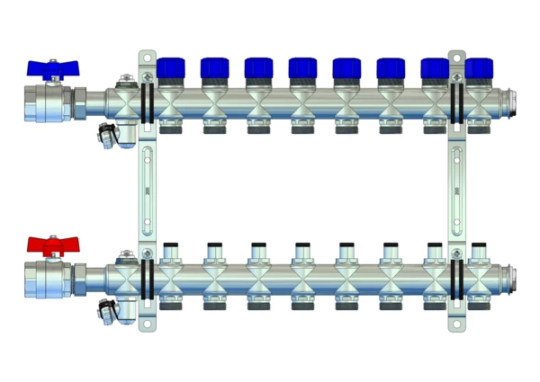Der Anschlussverteiler für Flächenheizung und -kühlung steht für einen herausragenden hydraulischen Abgleich der Heizkreise durch die Integration von manuell regulierbaren Ventilen im Vorlaufbalken und Ventileinsätzen (M30x1,5) im Rücklaufbalken. Der Primäranschluss beinhaltet eine Anschlussgarnitur ohne Wärmezählervorbereitung zum Absperren des Verteilers.