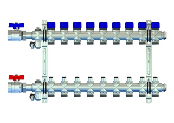 Der Anschlussverteiler für Flächenheizung und -kühlung steht für einen herausragenden hydraulischen Abgleich der Heizkreise durch die Integration von manuell regulierbaren Ventilen im Vorlaufbalken und Ventileinsätzen (M30x1,5) im Rücklaufbalken. Der Primäranschluss beinhaltet eine Anschlussgarnitur ohne Wärmezählervorbereitung zum Absperren des Verteilers.