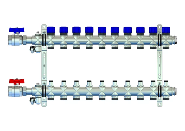 Der Anschlussverteiler für Flächenheizung und -kühlung steht für einen herausragenden hydraulischen Abgleich der Heizkreise durch die Integration von manuell regulierbaren Ventilen im Vorlaufbalken und Ventileinsätzen (M30x1,5) im Rücklaufbalken. Der Primäranschluss beinhaltet eine Anschlussgarnitur ohne Wärmezählervorbereitung zum Absperren des Verteilers.