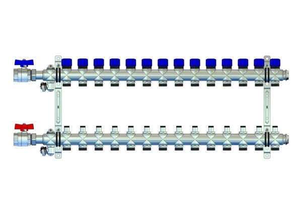 Der Anschlussverteiler für Flächenheizung und -kühlung steht für einen herausragenden hydraulischen Abgleich der Heizkreise durch die Integration von manuell regulierbaren Ventilen im Vorlaufbalken und Ventileinsätzen (M30x1,5) im Rücklaufbalken. Der Primäranschluss beinhaltet eine Anschlussgarnitur ohne Wärmezählervorbereitung zum Absperren des Verteilers.