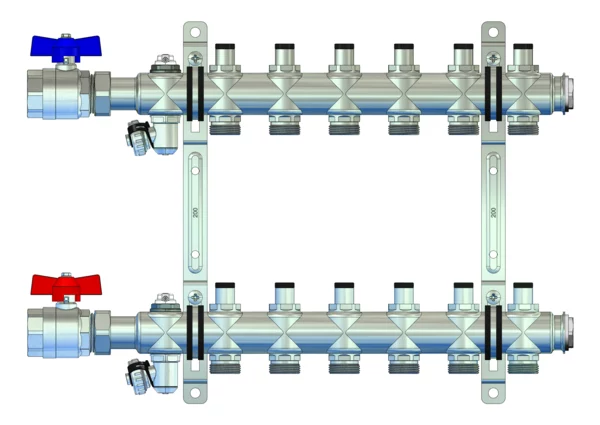 1. Kugelhahn-Set, integrierte Regulierventile im Vor- und Rücklaufbalken, Spül-, Füll- und Entleerventil und Entlüftungsventil im Vor- und Rücklaufbalken, Doppelwandhalter 200mm mit Schrauben und Dübeln