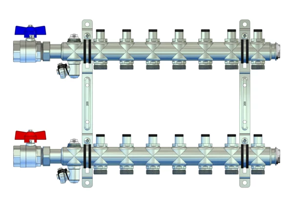 1. Kugelhahn-Set, integrierte Regulierventile im Vor- und Rücklaufbalken, Spül-, Füll- und Entleerventil und Entlüftungsventil im Vor- und Rücklaufbalken, Doppelwandhalter 200mm mit Schrauben und Dübeln