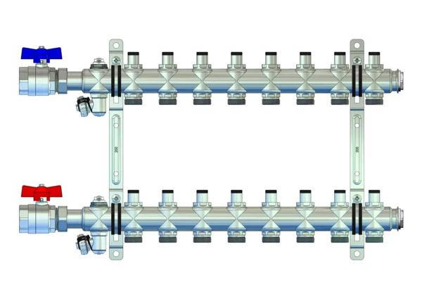 1. Kugelhahn-Set, integrierte Regulierventile im Vor- und Rücklaufbalken, Spül-, Füll- und Entleerventil und Entlüftungsventil im Vor- und Rücklaufbalken, Doppelwandhalter 200mm mit Schrauben und Dübeln